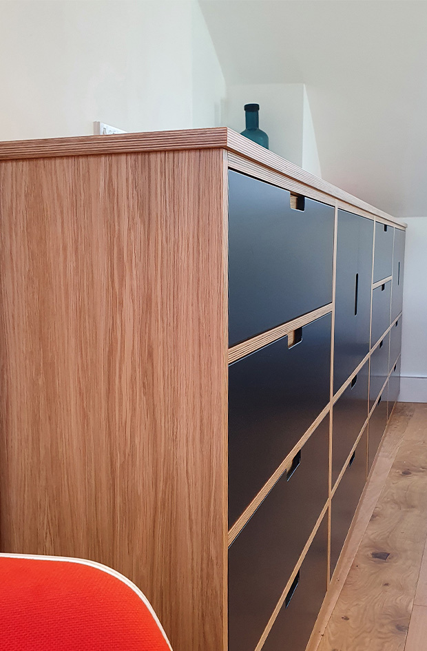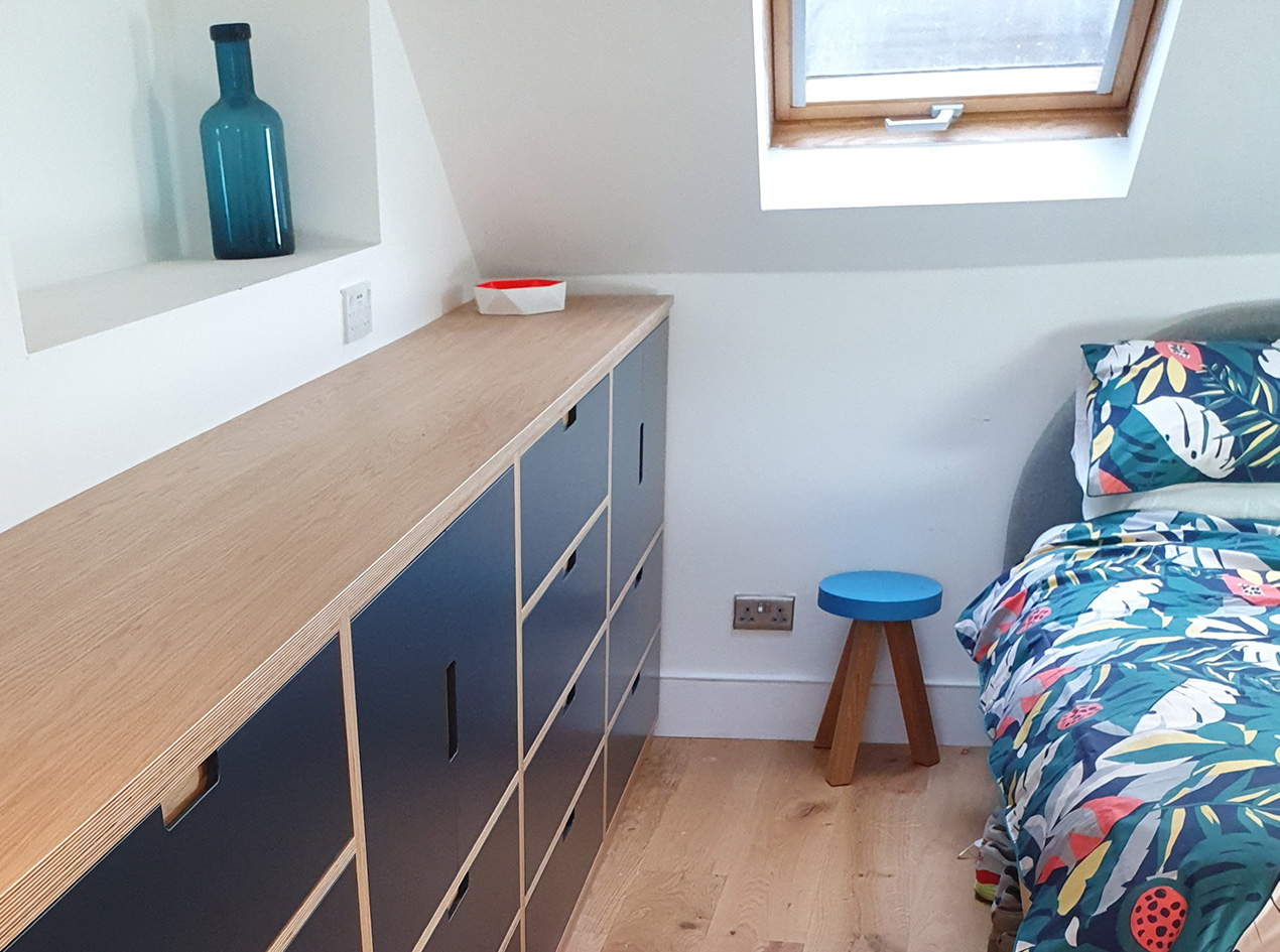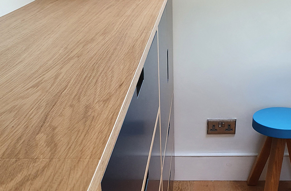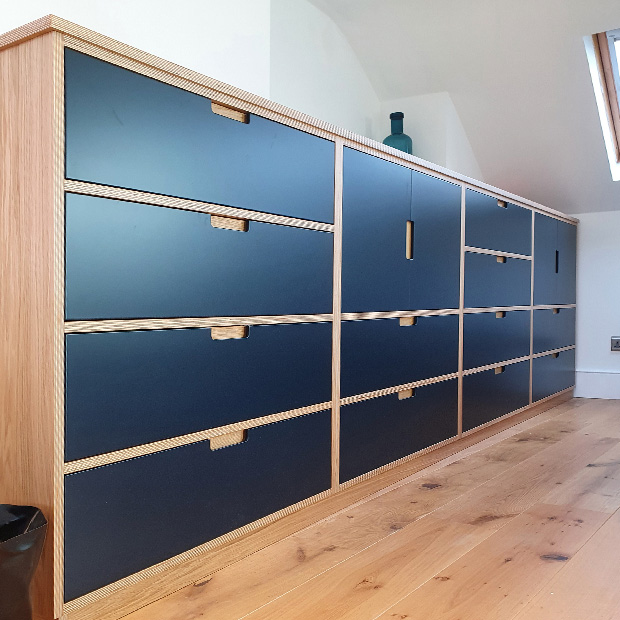 Materials: Bespoke oak veneered birch plywood with deep blue lacquered doors and drawer fronts. Real oak finger-pull details and Blum soft close fixings throughout.