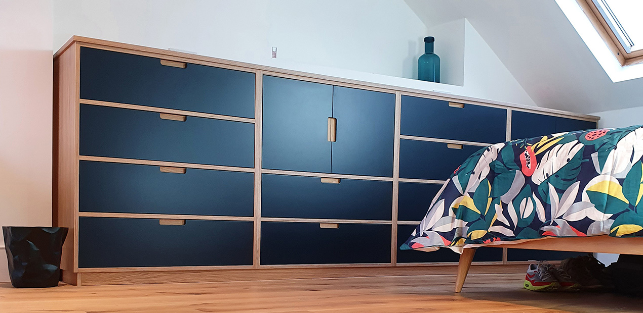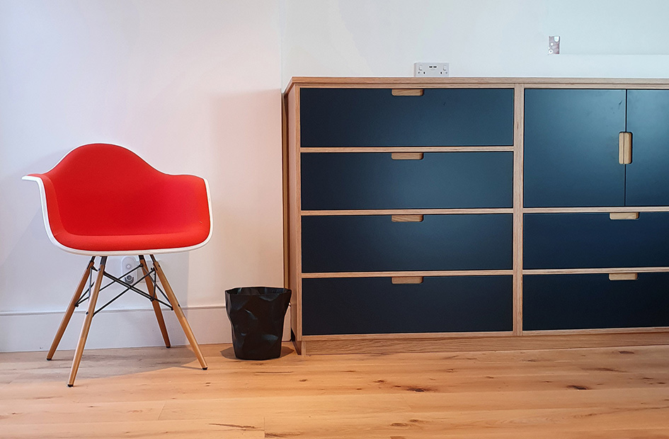 Project goal: To create a stand-alone piece of furniture to store a selection of clothes and various other things. The client wanted to use elements from a previous design I had worked on including the dark blue lacquer and the oak finger pull detail. They also wanted to use birch plywood to complement and tie in with the rest of the furniture in their home.